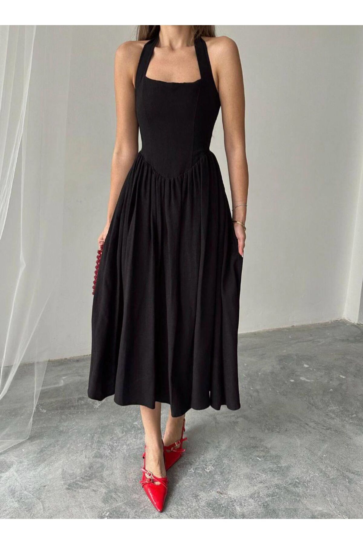 BOYUNDAN BAĞLAMALI KETEN KADIN ELBİSE RAHAT KALIP