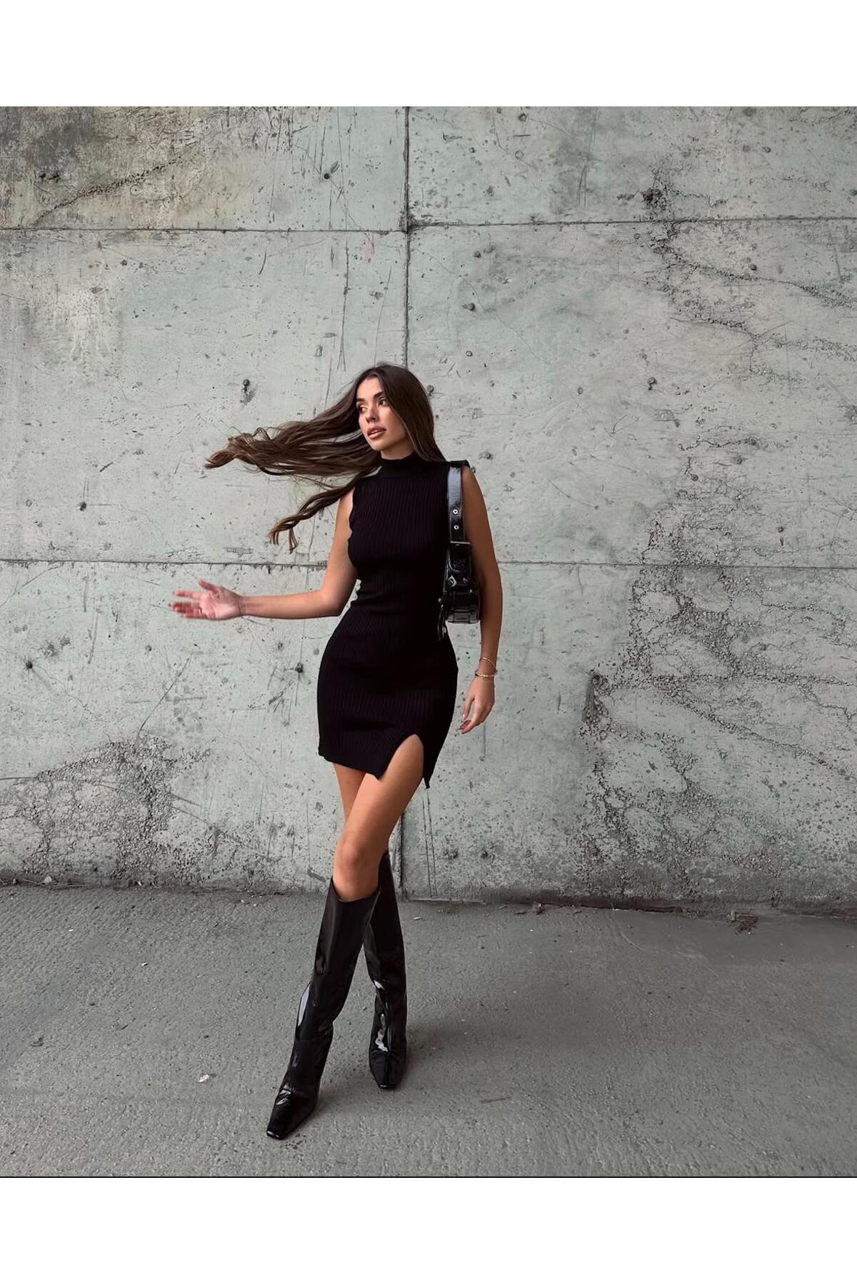 Fitil Örgü Hakim Yaka Yırtmaçlı Kolsuz Mini İnce Triko Kadın Elbise