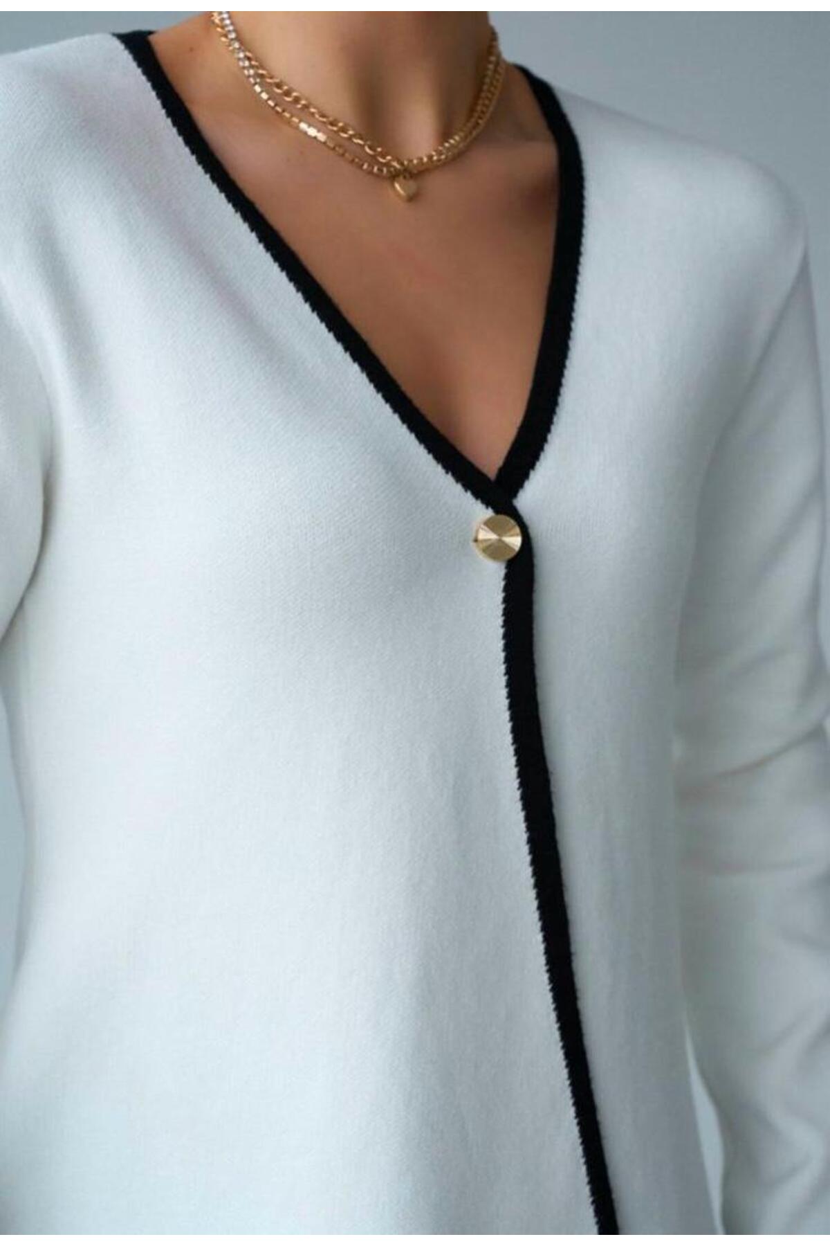 Kruvaze Düğmeli Siyahlı Beyazlı Kadın Hırka Rahat Kalıp